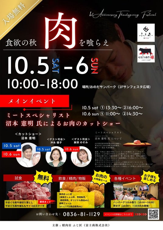 山口県を拠点に展開する富士商グループ(本社:山口県山陽小野田市稲荷町10-23 代表取締役:藤田 敏彦)の富士商株式会社(本社:山口県山陽小野田市 代表取締役:藤田 敏彦)が運営する精肉店 ふじ匠(所在地:山陽小野田市中川6丁目4番1号 おのだサンパーク西棟1階)は、2024年10月5日(土)、6日(日)に開店1周年記念イベント『ふじ匠1周年感謝祭 ~食欲の秋 肉を喰らえ!~』をおのだサンパーク1Fサンフェスタ広場で開催いたします。