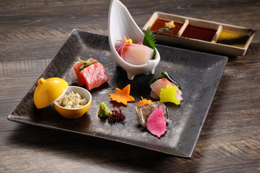 お造りには、相模湾と駿河湾で採れた地場産の刺身5種盛りでございます。