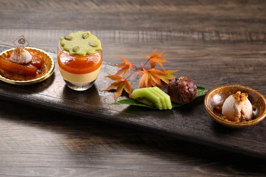 秋のお献立のデザートは、芥川龍之介、正岡子規など湯河原にゆかりのある文豪・作家の4人をモチーフにしたスイーツ4品。