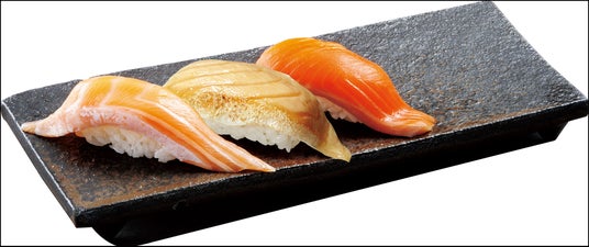 左から「トロサーモン、炙りトロサーモン、みやぎサーモンです。この3種のネタと共に9種のお寿司もご堪能ください!※写真はイメージです。