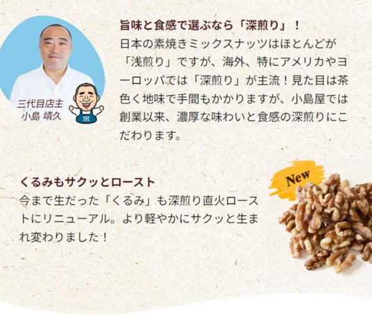 小島屋史上一番美味しい「深煎りミックスナッツ・素焼きミックスナッツ」です。