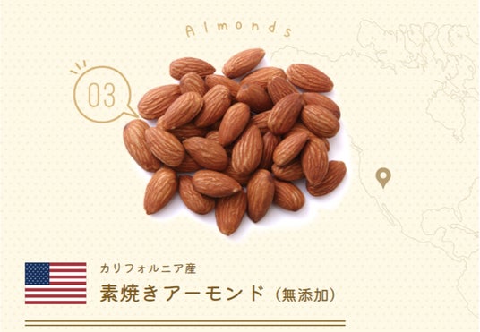 原材料:アーモンド(アメリカ産)・カシューナッツ(インド産)・クルミ(アメリカ産)・マカダミアンナッツ(オーストラリア産)