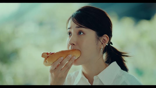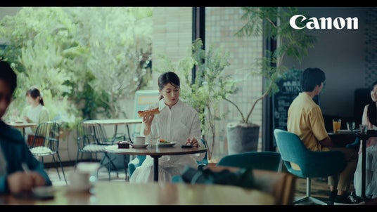 松本さんがカフェで食事をとっていたところに、キヤノンMJグループ社員を演じる賀来さんが突然登場します。賀来さんが、キヤノンMJグループは「超ワクワクする未来を実現する会社」であることを紹介しますが、松本さんはピンと来ていない様子。「カメラとかプリンターの会社?」と聞く松本さんに、キヤノンMJグループはそれらの技術をさらに発展させ、超ワクワクする未来をステークホルダーの皆さまと一緒に作っていきたいと伝えます。「超ワクワクってどれくらい?」と聞く松本さんに対し、賀来さんがコミカルな演技を交えて「ワクワク」感をアピールします。