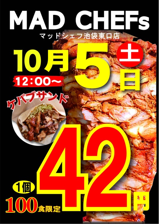 新商品発売キャンペーンとして10月5日(土)にケバブサンドを100食限定で1個”42円”で販売いたします!