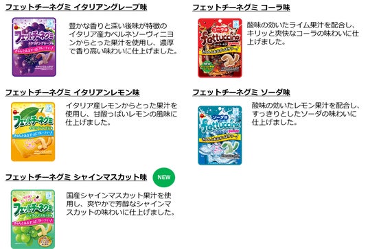 株式会社ブルボン(本社:新潟県柏崎市、代表取締役社長:吉田康)は、「フェットチーネグミ」シリーズの新商品「フェットチーネグミ シャインマスカット味」を9月24日(火)に発売します。