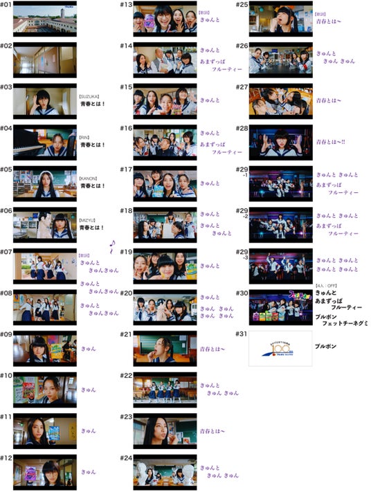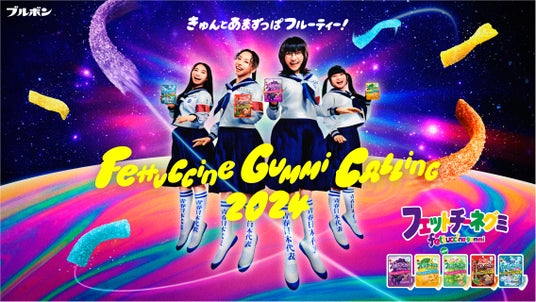 突如、教室の掃除道具入れから「青春とは!」と叫びながら登場するSUZUKAさん。すると音楽室や美術室、理科室など学校の様々な場所からRINさん、KANONさん、MIZYUさんが「青春とは!」と叫びながら登場し、4人揃って学校中を踊りながら移動します。先生や生徒、人体模型にまで次々とフェットチーネグミを食べさせ“きゅん”とさせていく一同。ミラーボールが回る音楽室にたどり着くと、最後には「新しい学校のリーダーズ」のみならず“きゅん”とした生徒たちも一緒に踊りだし、「きゅんとあまずっぱフルーティー! ブルボンフェットチーネグミ!」と声を揃えながらポーズを決めます。オリジナルソングもダンスもそれぞれパワーアップし、“きゅんとあまずっぱフルーティー!”な「フェットチーネグミ」の魅力をアピールします。