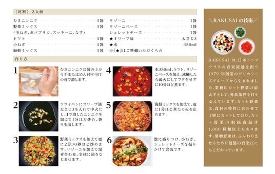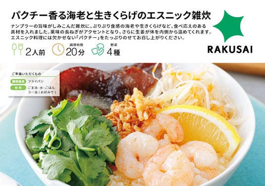 d130004-46-a38005c63e93aefcbc7f5258f16431e7.pdf 楽彩株式会社(本社:東京都足立区/代表取締役社長:大崎善保)は、この秋の新メニューとして“ポルトガル風海の幸のトマトリゾーニ”・“パクチー香る海老と生きくらげのエスニック雑炊”(2品)の販売を9月23日(月)よりスタートいたしました。「暑さ寒さも彼岸まで」といいますが、続く残暑で疲れたあなたに、食欲アップの秋の新メニューを提案いたします。