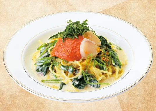 特長:からすみ、明太子、ホタテなど人気の食材を使用した贅沢な一皿。からすみと和風出汁を合わせた特製ソースと豆乳で仕立てた濃厚なスープが、パスタによく絡みます。明太子のピリ辛が程よいアクセント。