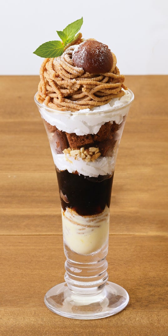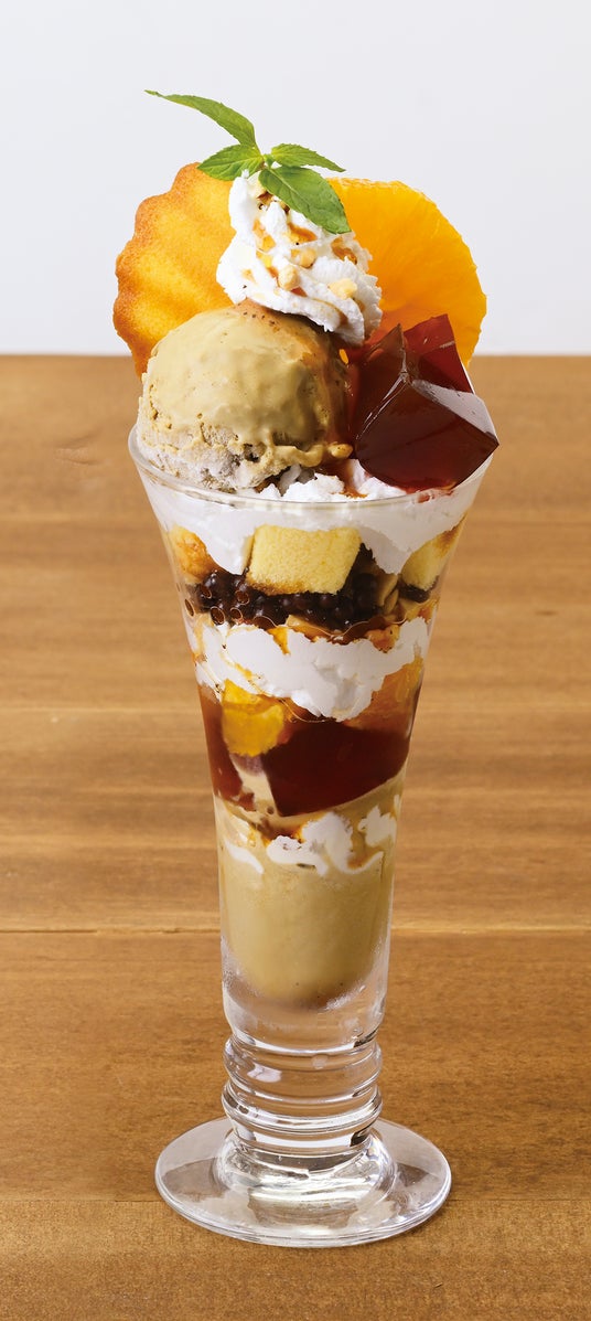 特長:和紅茶のアイスクリームに、店舗仕込みの和紅茶ゼリーと和紅茶シロップを重ね、オレンジとマドレーヌを飾った色合いも秋らしいパフェ。まろやかな味わいの和紅茶と相性のよいオレンジの爽やかな組み合わせをご堪能ください。
