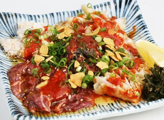 コブクロ、センマイ、ミミガーなどの新鮮なホルモン刺しにチョジャンを絡めました。