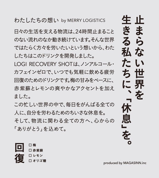 今年5月に販売を開始した “物流人礼賛”をコンセプトにしたクラフトビール【LOGI BEER】に続き、MERRY LOGISTICSオリジナルドリンク第2弾となる【LOGI RECOVERY SHOT】。
