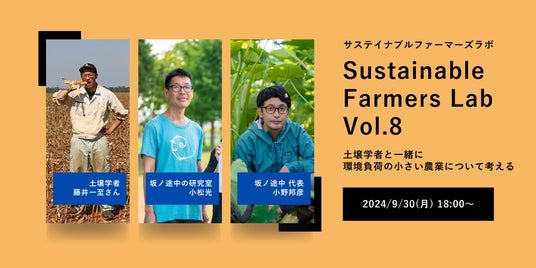 株式会社坂ノ途中(本社:京都市南区、代表取締役:小野邦彦)は、2024年9月30日(月)に土壌学者の藤井一至さんと環境負荷の小さい農業について考えるイベント「Sustainable Farmers Lab Vol.8(サステイナブルファーマーズラボ)」を開催します。