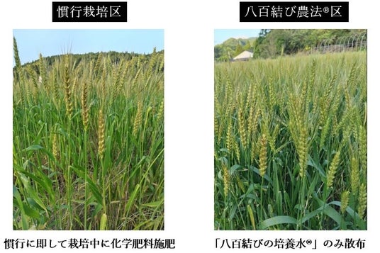 小麦圃場(鹿児島県)において、同日に同一株間での定植をして「八百結びの培養水(R)」の使用可否による比較栽培をした結果、「八百結びの培養水(R)」を使用した小麦の方が、株分けも多く、葉がイキイキと生育し、色つやも良く、生長期間が長くなりました。小麦は枯れてから収穫となりますが、枯れ始めるまでに10日間程度の差が出ました。この目に見える差は、1.健康効果の向上と 2.抗酸化作用によるものと考えられます。また、目視はできないものの作物内では、3.細胞の修復と再生、および 4.免疫調整作用、が得られていた可能性が推察されます。