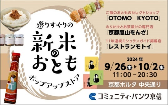 今回は、新米がおいしい季節を前に、ごはんのお供にぴったりの商品が集まるマルシェを開催。地域の事業者へのビジネスマッチングを支援するコミュニティ・バンク京信が選りすぐった京都の食品アイテムが並びます。
