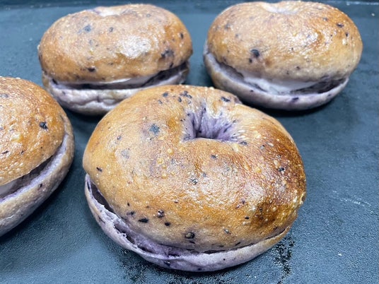 ブルーベリーとクリームチーズのベーグル(334円) ブルーベリーを練りこんだ爽やかでもっちりとしたベーグルに 北海道産のクリームチーズで作ったブルーベリークリームをサンドしています。
