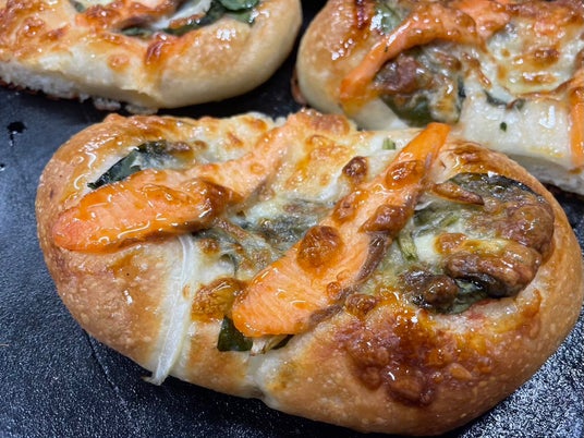 サーモンとほうれん草のフォカッチャ(278円) 自家製の天然酵母やエキストラバージンオリーブオイルで味わい深く仕上げた生地に、自家製のベシャメルソース、サーモン、ほうれん草を乗せて焼き上げています。