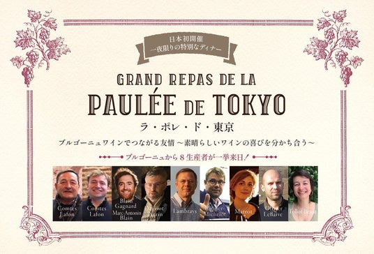 本イベントでは「ラ・ポレ・ド・ムルソー」を立ち上げたラフォン家よりドミニク・ラフォン氏(ドメーヌ・デ・コント・ラフォン元オーナー)が「ラ・ポレ・ド・東京」の会長として来日するほか、ブルゴーニュから8生産者が本イベントのために来日し、各生産者が厳選したドメーヌ蔵出しの希少ワインをふるまいます。ワインと食事を楽しみながら、ブルゴーニュでうれしい時に歌う「バン・ブルギニヨン」を生産者と共に手拍子するなど、「ラ・ポレ・ド・ムルソー」の楽しい雰囲気はそのままに、歌やバンド演奏を通して楽しい時間をお届けします。