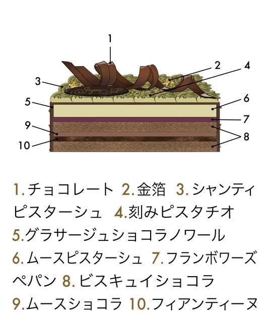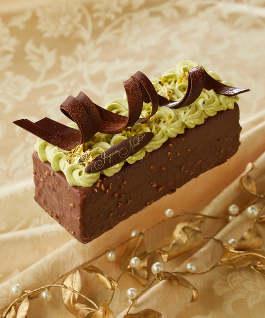 軽く滑らかなムースショコラにピスタチオのクリームを合わせ、フランボワーズぺパンの酸味をアクセントにしました。チョコレートとピスタチオとフランボワーズ、相性抜群の3つの素材を合わせたブッシュドノエルです。
