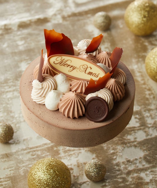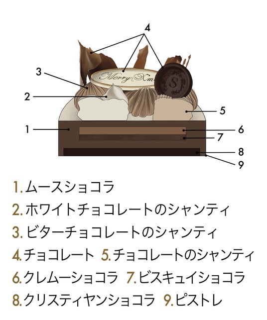 ケーキの上面に、ホワイトチョコレート・チョコレート・チョコートノワールの3種のシャンティを絞り、クリスマスらしく華やかでありながら落ち着きのあるモダンなデコレーションに仕上げました。カカオの産地ごとにクリームに向いているものや生地に向いているものとそれぞれ使い分け、最大限に魅力を引き出したチョコレートを満喫できるデコレーションです。