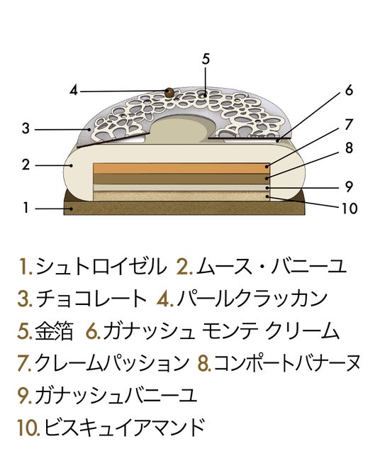 マダガスカル産の天然バニラを贅沢に使用した甘く口溶けの良いムースに、爽やかな酸味のパッションフルーツのクリームと完熟のバナナをキャラメリゼしたコンポートをあわせました。ビスキュイやシュトロイゼルのアーモンドの香ばしい風味や食感がアクセントとなり、パッションの酸味と、バナナ&バニラの甘みがお互いを引き立てあったガトーです