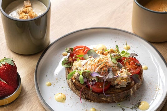 朝食には、具だくさんのこだわりオープンサンドをご用意しております。数種類の中から、お好きな1品をお選びいただけます。スープや季節のフルーツと一緒にお召し上がりください。