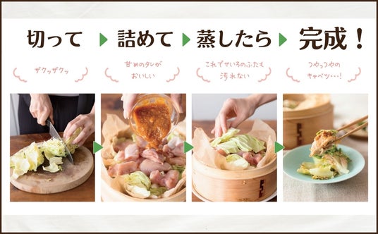 ▲素材本来のうまみや甘みが引き出されるから、余計な調味料や油を使わなくても十分においしい。ほったらかしで調理でき、蒸し上がったら、せいろのまま食卓へ出せるから、洗い物が少なくてすむのもうれしいところ。