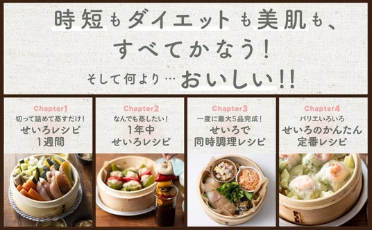 本書には、切って詰めて蒸すだけのデイリーレシピはもちろん、「え、こんなものも蒸しちゃうの?」と驚く意外なレシピまで掲載しています。「せいろ」で作る蒸し料理は手間がかかるように思えますが、実は簡単! 使ったあとは、さっと水洗いして乾かすだけでよいので、あと片づけもラクチンです。せいろビギナーに向けて、基本的なせいろの使い方とお手入れ法もわかりやすく解説しています。