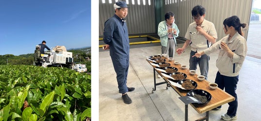 茶葉収穫の様子 紅茶の試飲評価の様子