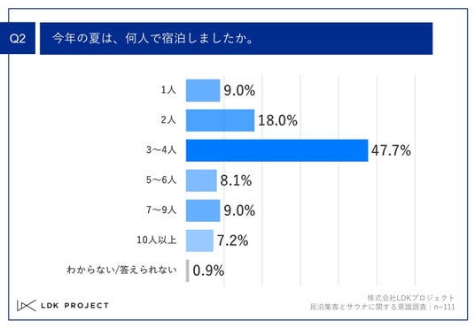 Q1で「わからない/答えられない」以外を回答した方に、「Q2.今年の夏は、何人で宿泊しましたか。」(n=111)と質問したところ、「3~4人」が47.7%、「2人」が18.0%、「1人」が9.0%、「7~9人」が9.0%という回答となりました。