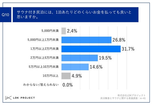 Q7で「サウナありの民泊」と回答した方に、「Q10.サウナ付き民泊には、1泊あたりどのくらいお金を払っても良いと思いますか。」(n=41)と質問したところ、「1万円以上2万円未満」が31.7%、「5,000円以上1万円未満」が26.8%、「2万円以上5万円未満」が19.5%という回答となりました。