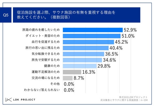 Q4で「非常に重視する」「やや重視する」と回答した方に、「Q5.宿泊施設を選ぶ際、サウナ施設の有無を重視する理由を教えてください。(複数回答)」(n=104)と質問したところ、「旅路の疲れを癒したいため」が52.9%、「ダイエット・美容のため」が51.0%、「血行を促進するため」が45.2%という回答となりました。