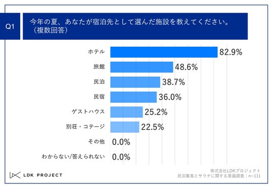 「Q1.今年の夏、あなたが宿泊先として選んだ施設を教えてください。(複数回答)」(n=111)と質問したところ、「ホテル」が82.9%、「旅館」が48.6%、「民泊」が38.7%という回答となりました。