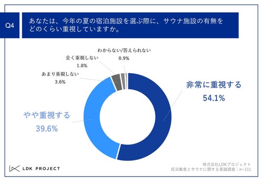 Q1で「わからない/答えられない」以外を回答した方に、「Q4.あなたは、今年の夏の宿泊施設を選ぶ際に、サウナ施設の有無をどのくらい重視していますか。」(n=111)と質問したところ、「非常に重視する」が54.1%、「やや重視する」が39.6%という回答となりました。
