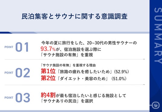 まず、今年の夏の宿泊先として「ホテル」(82.9%)、「旅館」(48.6%)、「民泊」(38.7%)を選んだことがわかりました。宿泊先を選ぶ際に重視するポイントとしては、「宿泊料金の安さ」が27.9%でトップとなり、続いて「食事の質や種類の多さ」が19.8%、「立地・アクセスの良さ」が17.1%と続きました。また、宿泊先を選ぶ際に「サウナ施設の有無」を「非常に重視する」と回答した人は54.1%、「やや重視する」が39.6%との結果から、「サウナ施設の有無」が宿泊先選択の重要な要素であることがわかりました。サウナ施設を重視する理由としては、「旅路の疲れを癒したい」(52.9%)、「ダイエット・美容のため」(51.0%)が上位に挙げられました。「サウナありの民泊」に宿泊したいと思う理由では、「大人数で宿泊ができる」(48.8%)、「貸切でプライベート感がある」(41.5%)、「人との接触が少ないため」(41.5%)という結果から、大人数で楽しめることやプライベート感を重視するサウナ―にとって「サウナありの民泊」は魅力的な選択肢であることがわかりました。
