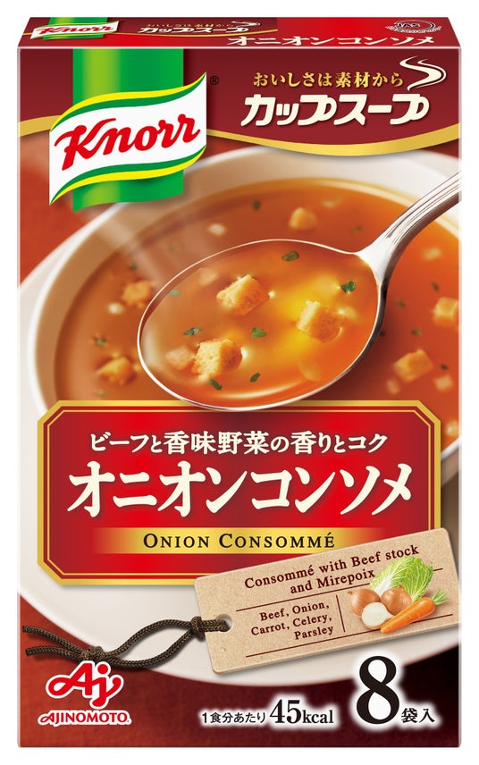 「クノール(R) カップスープ」オニオンコンソメ時間をかけて引き出したオニオンとビーフのおいしさが溶け込んだ、風味豊かでクリアなスープです。