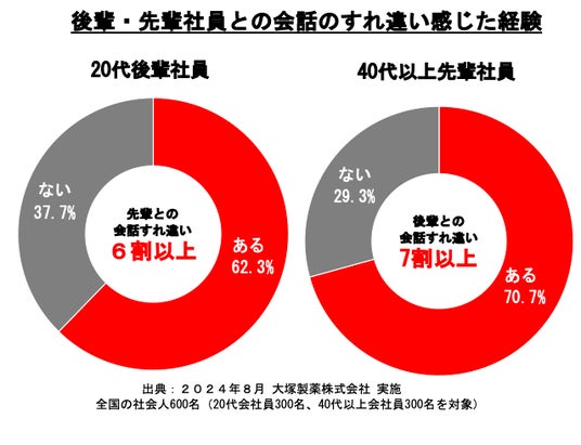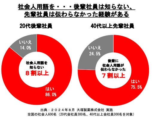 当社が実施した調査によると、職場において世代間のコミュニケーションにすれ違いが発生していました。その一因として、「一丁目一番地」や「全員野球」などの社会人用語に対して「後輩社員の8割が知らない」かつ「先輩社員の7割が伝わらなかった経験がある」という結果が確認されました。さらに、社会人用語が原因で会話のすれ違いを感じたことがある人の割合を調査したところ、20代の後輩社員では約半数が、40代以上の先輩社員では約7割以上が、そのような経験を持っていることがわかりました。