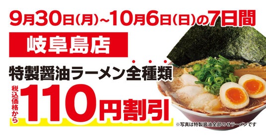 この度オープンを記念して、「岐阜島店」にご来店いただいたお客様には、『特製醤油ラーメン全種類』を税込価格から110円割引で販売いたします。