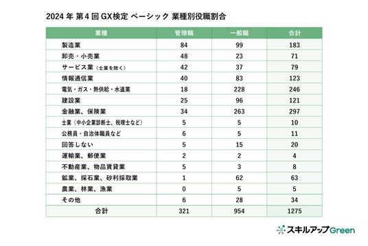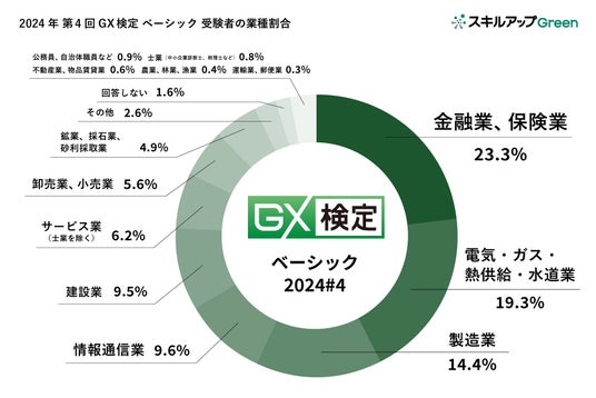 「2024年第1回GX検定 ベーシック」の受験者を業種別に見ると、上位から金融業、保険業/電気・ガス・熱供給・水道業 / 製造業 / 情報通信業 / と続きます。
