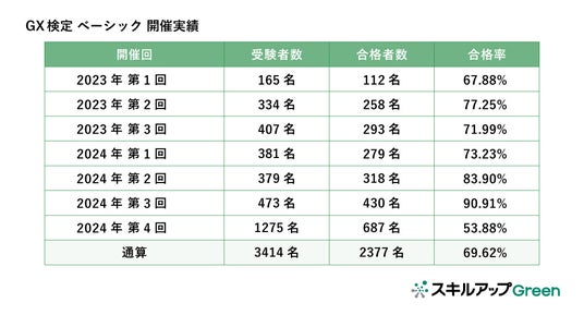 GX人材育成プログラム「スキルアップGreen」やGX検定を展開する株式会社スキルアップNeXt(東京都千代田区神田神保町2丁目40-5、代表取締役 田原 眞一)は、2024年8月5日(月)~ 2024年8月29日(木)に開催した「2024年第4回GX検定 ベーシック」の合格者を発表しました。1,275名が受験し687名が合格、合格率は53.88%となりました。初回となる2023年第1回試験からの通算の受験者数は3,414名、合格者数は2,377名となります。「GX検定 ベーシック」は環境省脱炭素アドバイザー資格制度の認定を受けているため、合格者は「環境省認定制度脱炭素アドバイザー ベーシック」を名乗ることができます。