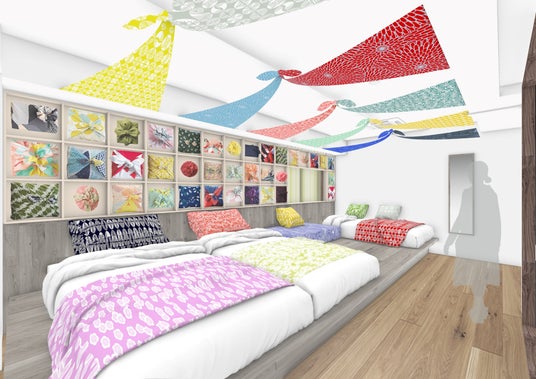 風呂敷は平面にも立体にも楽しめて、アートにもなれ、自らの手で創り出すこともできます。客室は大小さまざま色とりどりの風呂敷で装飾し、まるで風呂敷に包まれるような空間に仕上げます。天井や壁にもアートとして風呂敷を施すほか、クッションカバーやティッシュケース、ベッドランナーなど、様々な姿に変身し、日常を彩る風呂敷の使い方を発見できるよう設える予定です。また、旅を終え日常生活でも風呂敷を活用できるよう、むす美の想いやコンセプトとともに、風呂敷の使い方を案内するパンフレットを用意。さらに、本客室宿泊者限定でOMOオリジナル風呂敷のプレゼントもあるため、京都散策や旅の後でも、風呂敷を使うことができます。
