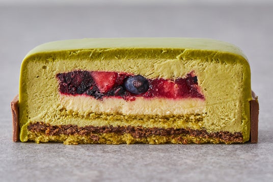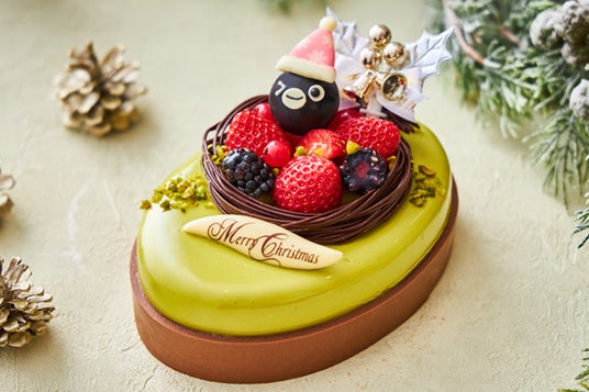 ウインクする表情が愛らしい、サンタ帽をかぶったSuicaのペンギン。苺・木苺・ブルーベリーが入ったゼリーとマスカルポーネムースをピスタチオムースで包み、ピスタチオのビスキーやフィヤンティーヌに重ねました。いろいろな食感と、ピスタチオの香ばしく甘いテイストをお楽しみください。