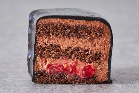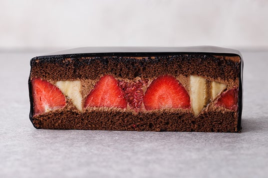 木苺風味のビターチョコレートムースや木苺の果肉とコンフィチュールをチョコレートスポンジでサンドし、サンタクロースに扮したSuicaのペンギンとフルーツなどをトップに飾りました。木苺の甘酸っぱさと、ビターチョコレートのほろ苦さのバランスがとれたリース型のケーキです。