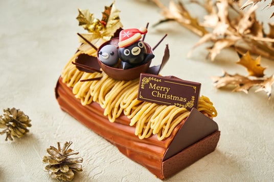 いが栗の中から顔を出すSuicaのペンギンと子ペンギンがキュート。チョコレートのクッキーとビスキーに、笠間の栗の渋皮煮の入ったマロンババロアとコーヒーブリュレを重ね、キャラメルチョコレートムースで包んだ、大人な味わいのケーキです。