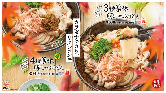 讃岐うどんチェーン「はなまるうどん」を展開する株式会社はなまる(本社:東京都中央区 代表取締役社長:前田良博、以下はなまる)は、2024年9月26日(木)より、全国(※一部店舗除く)のはなまるうどんにて、「3種薬味豚しゃぶうどん」「4種薬味豚しゃぶうどん」を期間限定発売いたします。
