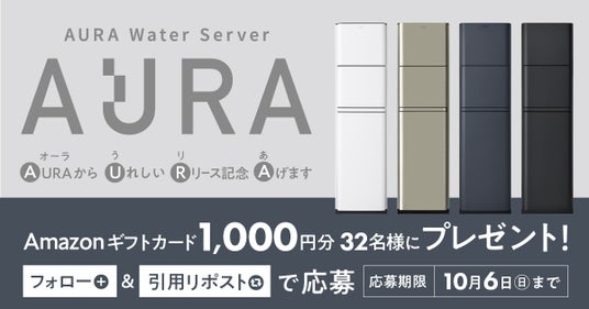 『AURA Water Server』リリースを記念して、プレミアムウォーター公式Xアカウントにてプレゼントキャンペーンを実施いたします。9月26日(木)~10月6日(日)のキャンペーン期間中、プレミアムウォーター公式Xアカウントをフォローし、「#プレミアムウォーター」、「#AURAリリース記念」のハッシュタグをつけて対象の投稿を引用リポストいただいた方の中から抽選で32名様に「Amazonギフトカード1,000円分」をプレゼントいたします。