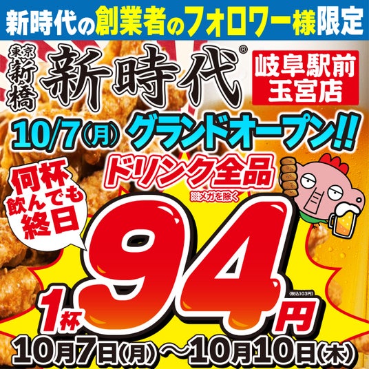 オープン記念キャンペーンを開催!「新時代 岐阜駅前玉宮店」のオープンを記念し、10月7日(月)~10月10日(木)までメガ以外のドリンク全品、何杯飲んでも1杯94円(税込み103円)キャンペーンを開催します。