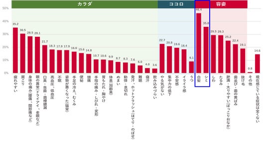 ・現在感じている症状を詳しく聴取したところ、「白髪」が約半数の46.4%だった。2位の「シミ」(35.8%)と約10ポイントの差があり、突出して高かった。