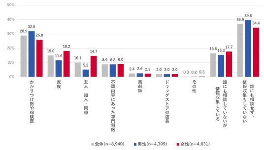 ・心身不調や悩みがあると回答した方に、心身の悩みを誰に相談するかを聴取した。「誰にも相談せず、情報収集もしていない」が全体で最も高く、36.9%だった。性別で見ると、男性の方が女性よりも5.2ポイント高かった。また、男性は女性に比べて、特に「家族」「友人・知人・同僚」が低かった。身近な人に相談していない傾向が伺える。