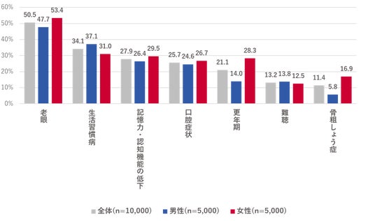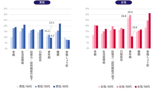 ・性別で見ると、男性は女性よりも「生活習慣病」が6.1ポイント高かった。女性は男性よりも「更年期」が14.3ポイント、「骨粗しょう症」が11.1ポイント高かった。女性の更年期については、40代、50代で症状を感じる人が多い結果となった。