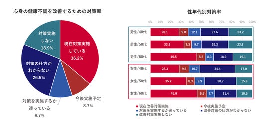 ・心身不調や悩みがあると回答した方に、心身の健康不調を改善するための対策の実施状況を伺ったところ、現在実施している人は約4割だった。一方、加齢、更年期等による心身の不調はあるものの、それに対する改善対策を実施しない人は18.9%、改善対策の仕方が分からない人は26.5%だった。